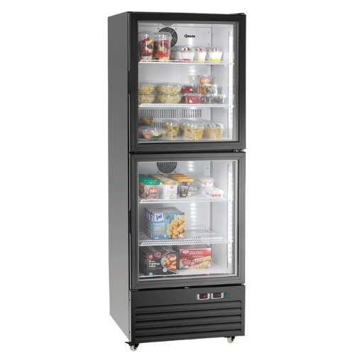 Dette kombinasjonskjøle/fryseskapet har en tiltalende sort design og et volum på 430 liter. Glassdørene lar kundene se maten inne, som kan fremheves ved hjelp av de separat kontrollerbare LED-lysene.