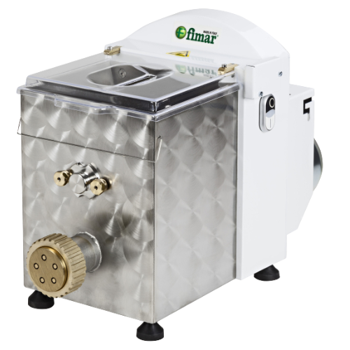 Maskin for å blande og forme pasta i forskjellige former. Belagt med ripesikker maling. AISI 304 rustfri bolle og elter. Kniv av messing/bronselegering. Mikrobryter på lokk.