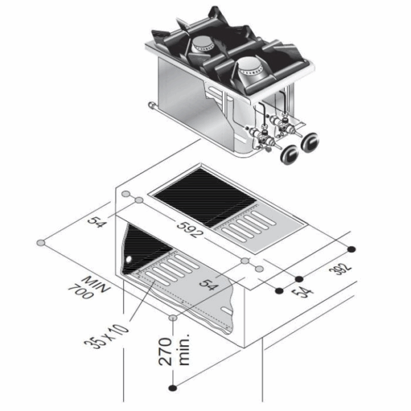 EAN-kode: 6017457662693 Bredde (mm): 400 Dybde (mm): 600 Høyde (mm): 270 Pakken er klar: Ingen Bruttovekt (kg): 16 Versjon: Gass Brennerkapasitet / -divisjon (kW): 1x 3,5 / 1x 5,5 Antall brennere: 2