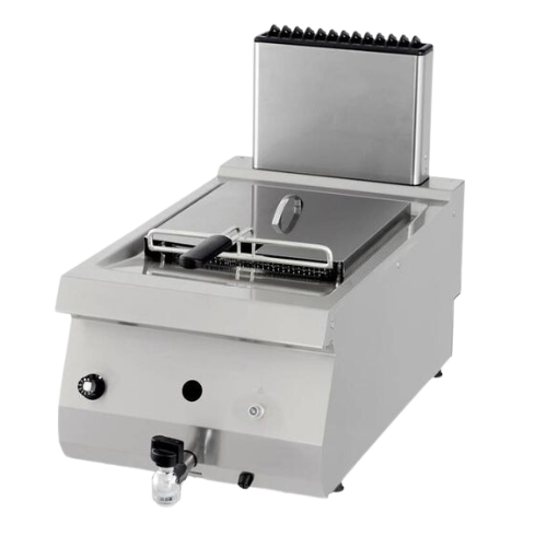 Denne kraftige frityrkokeren går på gass (LPG eller naturgass) og kan stilles inn på en temperatur mellom 110 og 190ºC. Dens ergonomiske og hygieniske design gjør den til et fint apparat å jobbe med. For sikkerhets skyld er det innebygget en gasssikkerhetsventil med termoelement. Videre er frityrkokeren utstyrt med et pilotlys. Frityrkokeren har også en avløpskran for enkel fjerning av frityrolje. Frityrkokeren leveres som standard med lokk i rustfritt stål og frityrkurv.