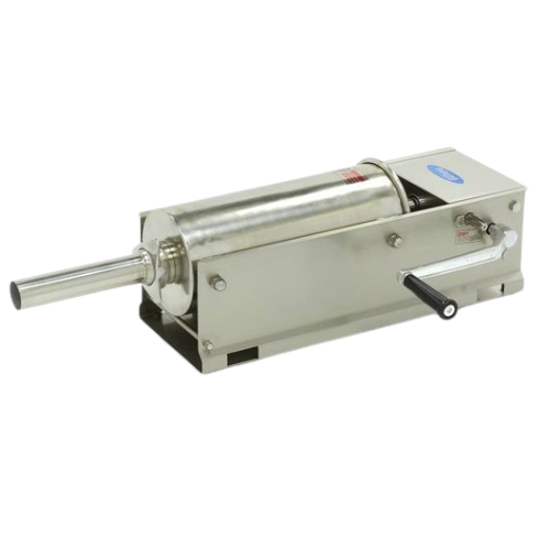 Hvis du vil lage pølser raskt og effektivt, bruk en profesjonell pølsemaker. Takket være den horisontale posisjonen passer denne pølsestapperen på enhver benkeplate. Med en fyllkapasitet på 5 liter kan du raskt lage et stort antall pølser. Hylsen som pølsene er laget i kan enkelt skyves over ett av de fire påfyllingsrørene som følger med. Dimensjonene til påfyllingsrørene er: 16, 22, 32 og 38 mm diameter. Da trykkplaten er forsynt med et hull for utlufting, kommer minst mulig luft inn i pølsene. I tillegg er den omsluttet med en forsegling. På siden er det en sveiv som kan betjenes manuelt for å lage pølser i to hastigheter.