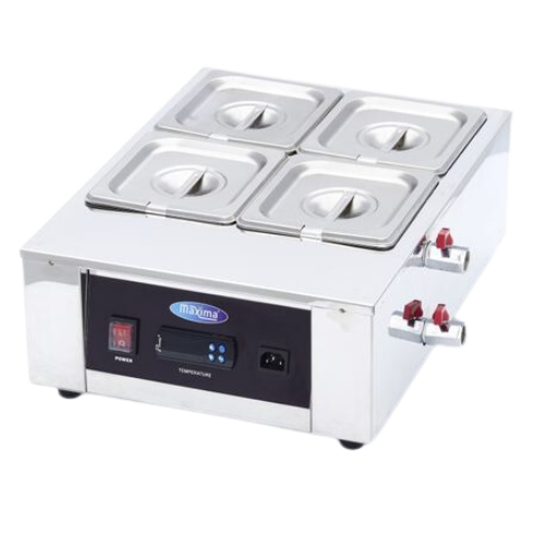 En utfordring når du smelter sjokolade er å forhindre at den brenner seg. Fordi sjokolade allerede smelter ved lave temperaturer, anbefales det å ikke sette temperaturen for høyt slik at sjokoladen smelter sakte og jevnt. Det digitale displayet viser den nøyaktige temperaturen på vannet og GN-brettene. Ved hjelp av piltastene kan du justere temperaturen opp eller ned. Dette er spesielt viktig med hvit sjokolade, som smelter ved 36°C, noe som øker risikoen for forbrenning sammenlignet med mørk sjokolade eller melkesjokolade.
