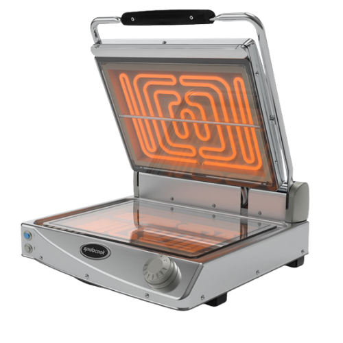 Energibesparende kontaktgrill med transparent glatt plate, 2 kW og maks 400°C.