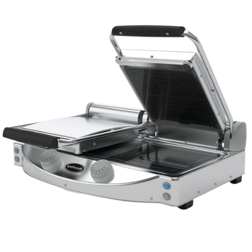 Dobbel energibesparende kontaktgrill med ribbet topp og glatt bunn.