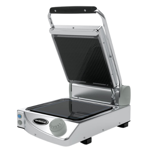 Kompakt kontaktgrill med ribbet topp og glatt bunn, 1,5 kW og maks 400°C.