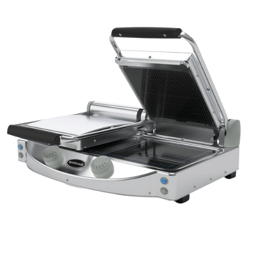Dobbel kontaktgrill med ribbet topp og glatt bunn, 3 kW og maks 400°C.