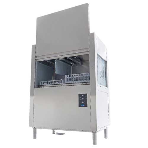 Denne oppvaskmaskinen for transportbånd er ideell for rengjøring av store mengder oppvask, spesielt på travle tider på dagen. Stativene med skitten servise glir raskt og enkelt gjennom stativtransportmaskinen for en komplett vask som etterlater dem rene og klare til bruk igjen. Denne kommersielle oppvaskmaskinen har kapasitet til å rengjøre mellom 60 og 120 stativer i timen. Den kan forlenges med et rustfritt stålbord med ruller på venstre side av oppvaskmaskinen.