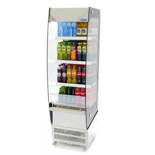 Et åpent kjøleskap er ideelt for bruk i alle serveringssteder, spesielt de som tilbyr selvbetjening. Produktene presenteres på en attraktiv og profesjonell måte i tre forskjellige hyller. Den innebygde LED-belysningen setter bokstavelig talt mat og drikke i søkelyset slik at kundene kan velge sine egne alternativer. Hyllene er også utstyrt med kortholdere for plassering av prislapper. I tillegg har dette åpne displaykjøleskapet to hjul med bremser slik at det enkelt kan flyttes rundt. Den leveres med håndtak og støtfanger. Glassrutene på sidene av vitrinen har doble glass, og de buede glassplatene er montert på et hus i kromstål.