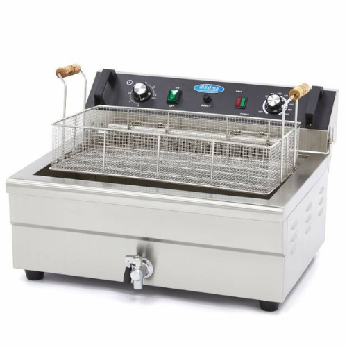 Denne profesjonelle frityrkokeren fra Max består av deler av høy kvalitet. Stekepannen er utstyrt med en kran for matoljen og er laget av rustfritt stål. Med en kapasitet på 20 liter er dette en veldig kompakt maskin som er egnet for intensiv bruk. Den glatte overflaten på maskinen gjør den enkel å rengjøre, og takket være den praktiske kranen kan innsiden også enkelt rengjøres.