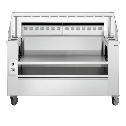 | Utstyrt med | Oppbevaringsrom under innstillingsnisjene, mål: B 1200 x D 600 x H 150 mm 4 GN-beholdere 1/9 GN, 100 mm dype for oljer, sauser, kokebestikk Integrert elektrisk sikring Integrert ventilasjon med labyrintfilter |