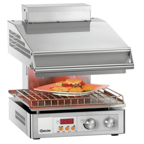 Pressgrill Panini Panini-T" 1G Merke: BARTSCHER (GERMANY) Varenr:A150679 materialerustfritt stål Utvendig Mål:(BxDxH)41x40x20cm Mål topplate:BxD:33,5X22cm slett topp plate Mål bunnplate:BxD:33,5X23cm slett bunn plate Kobling: 50 Hz 230V 1 fas Effekt:2,2KW Grillplater av støpejern for ideell varmeoverføring Temperaturområde: 50-300 C Vekt:18,6kg Følger med 1 rengjøringsbørste Ideell for tilberedning av snacks. For oppvarming av flatbrød,pitabrød osv. Til grilling er kontaktgrillene allsidige. Fjern
