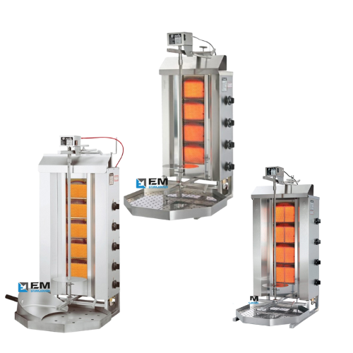 Potis tilbyr forskjellige modeller av vertikale kebabgriller som passer til ulike behov og kapasiteter. Disse grillene er utstyrt med funksjoner som justerbar rotasjonshastighet, individuelle brennere for optimal varmefordeling, justerbar høyde på spydene og enkel rengjøring.