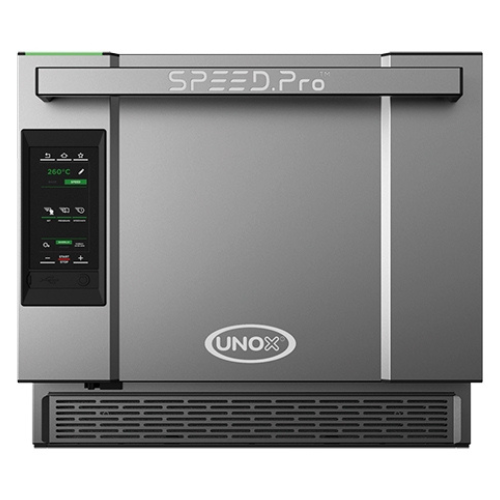 den innovative UNOX Bakerlux SPEED.Pro varmer raskt opp all mat ved å kombinere konveksjon, ledning og mikrobølgeovn. Ovnen forblir på driftstemperatur selv i standby-fasen. Takket være den spesielle SPEED-Plate (45×33 cm overflate) kan du for eksempel bake opptil 4 smørbrød samtidig på 75 sekunder. I BAKE-modus kan du kjøre flertrinns bakeprogrammer eller bruke de automatiske CHEFUNOX-programmene. Under BAKE-modus har du tilgang til et romslig stekekammer med 1 vifte og 3 nivåer der du kan plassere ulike tallerkener eller rister (46×33 cm). Kombinasjonen av både en vanlig konveksjonsovn og en hurtigovn i én enhet gjør UNOX BAKERLUX SPEED.Pro til en unik enhet som kan brukes svært mye i gjestfrihetsbransjen